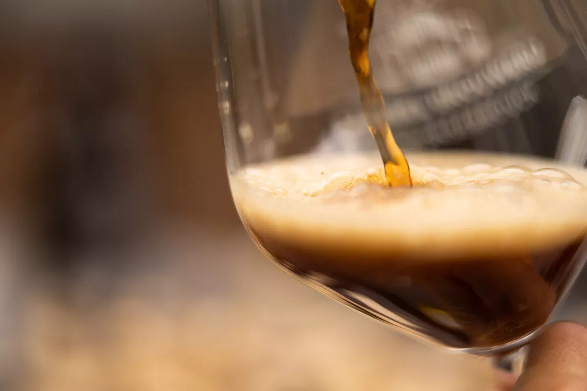 Uitzicht De donkere, bijna gitzwarte kleur en de schuimkraag vol kleine luchtbelletjes doen denken aan een porter en stout, twee Britse bierstijlen.
