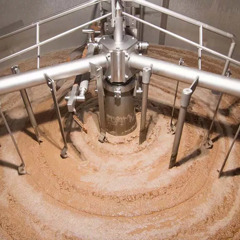 Filtering After mashing, we are left with a high-sugar liquid containing solid chaff particles. For the next step of the brewing process, we separate these residues, or ‘draff’, from the ‘wort’, with the chaff serving as a filtration layer. The draff is collected and distributed to dairy farmers. Once the mash has been filtered, we are left with the wort, a high-sugar liquid that will soon be turned into beer.