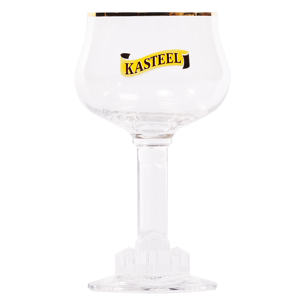 Het Kasteelglas is van kop tot teen royaal. De ronde kelk steunt op een stevige steel die overloopt in een opvallende voet met daarop het moderne Bierkasteel in 3D-vorm. Een echte eyecatcher die vraagt om gevuld te worden met de rijke smaak van een Kasteelbier!